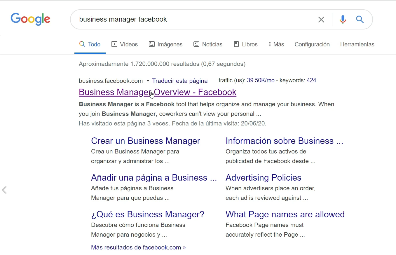 Puedes acceder a Business Manager directamente desde https://business.facebook.com/ o buscándolo en Google.